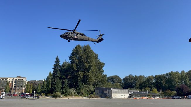 11:27 AM: As previewed last week, the city is partnering with the Washington National Guard today and tomorrow for a disaster drill involving a helicopter. We’re at the Joint Training Facility in southeast West Seattle to find out more; the helicopter they’re using flew eastbound over West Seattle around 9:45 am, headed this way, and now it’s just taken off for practice hoisting from and to a building on the west edge of the JTF. They’ll be focusing the drill here unless there’s a problem and they need to fly elsewhere. More photos and info later!