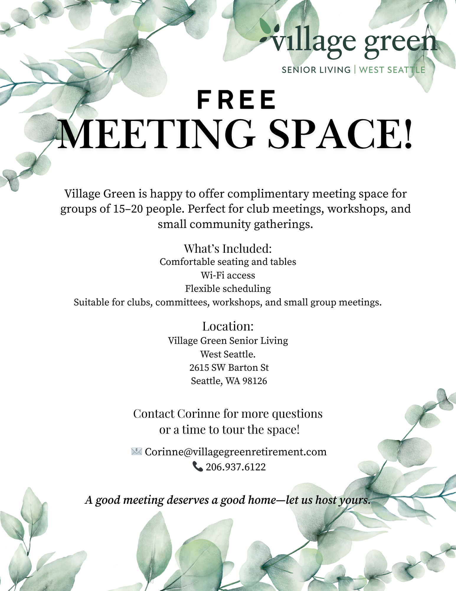 Village Green Senior Living in West Seattle is offering free meeting space for groups of 15–20 people. It’s a great option for clubs, workshops, committees, and small community meetups. The space includes comfortable seating, Wi‑Fi, and flexible scheduling, all in a warm and inviting setting.